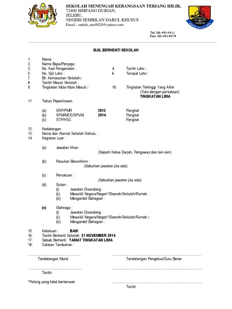 Tapi yang menjadi masalahnya sijil berhenti sekolah hilang la pulak. Cik siti step to do when your sijil berhenti sekolah hilang. Sekolah menengah kebangsaan methodist 36900 tanjong malim perak. Sijil berhenti sekolah menengah in english kronis q. Cara permohonan salinan keputusan peperiksaan hilang. This page is about contoh surat berhenti sekolahcontains student affairs contoh.